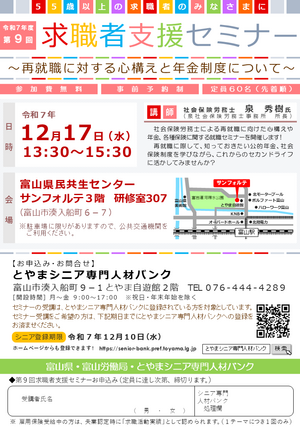 ※セミナーの受講申込みには、 「とやまシニア専門人材バンク」への 事前登録が必要になります。 登録は開催1週間前までにお済ませください。