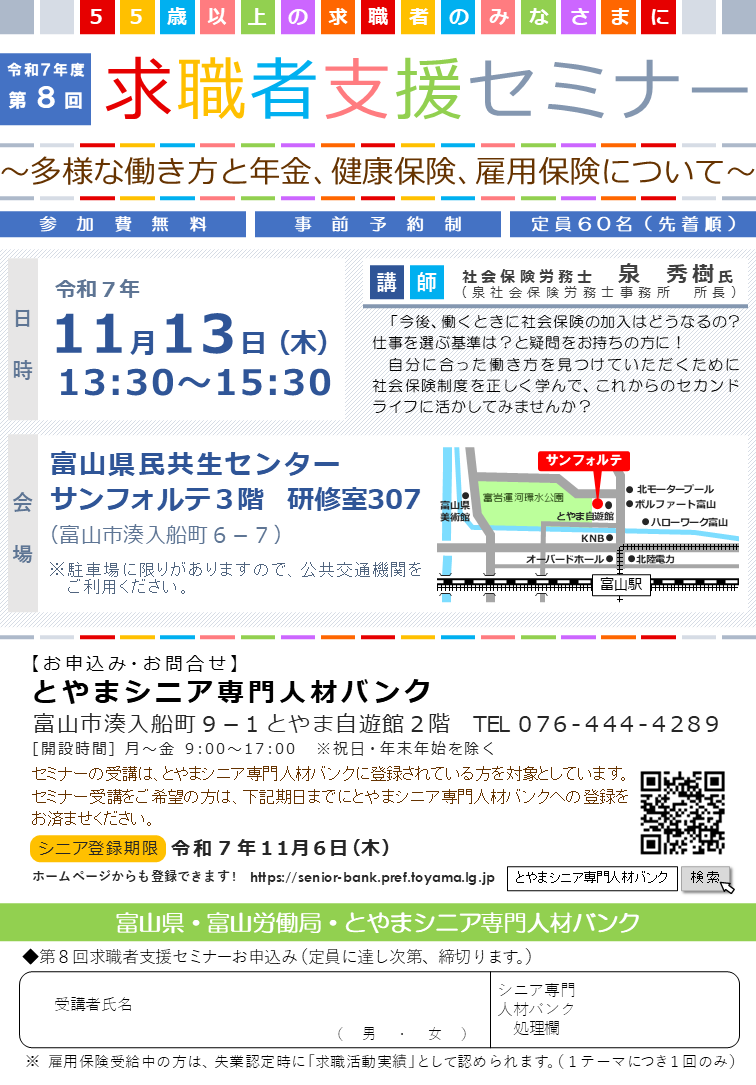 ※セミナーの受講申込みには、 「とやまシニア専門人材バンク」への 事前登録が必要になります。 登録は開催1週間前までにお済ませください。