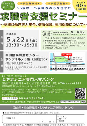※セミナーの受講申込みには、 「とやまシニア専門人材バンク」への 事前登録が必要になります。 登録は開催1週間前までにお済ませください。