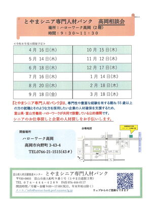 New 『とやまシニア専門人材バンク 高岡相談会』のご案内 | + |